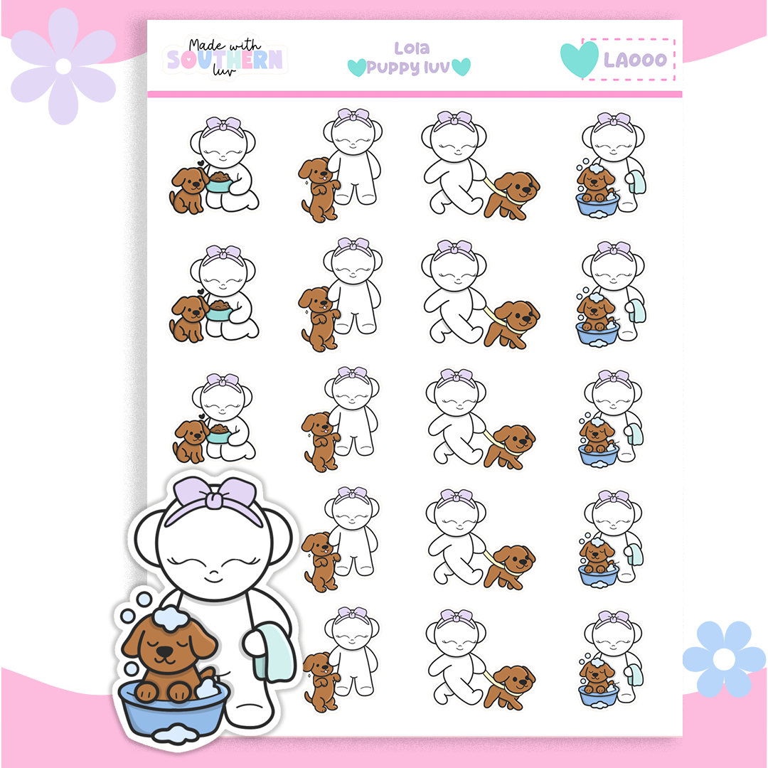 Spend the day with Lola and her adorable puppy in this cozy character sticker sheet. Featuring sweet everyday moments like cuddling, walking, and bath time, this sheet is perfect for adding personality and warmth to your planner.