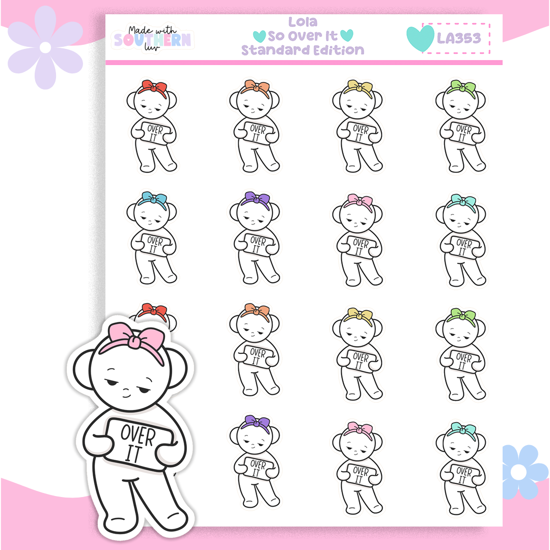 Lola So Over It is your quiet burnout bestie. She’s holding her “OVER IT” sign with full emotional exhaustion energy — perfect for marking long days, chaotic meetings, or simply surviving the week.